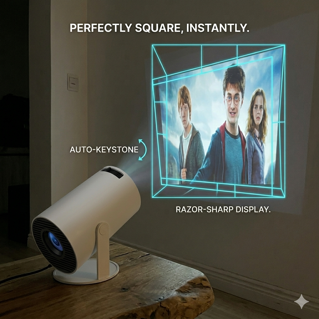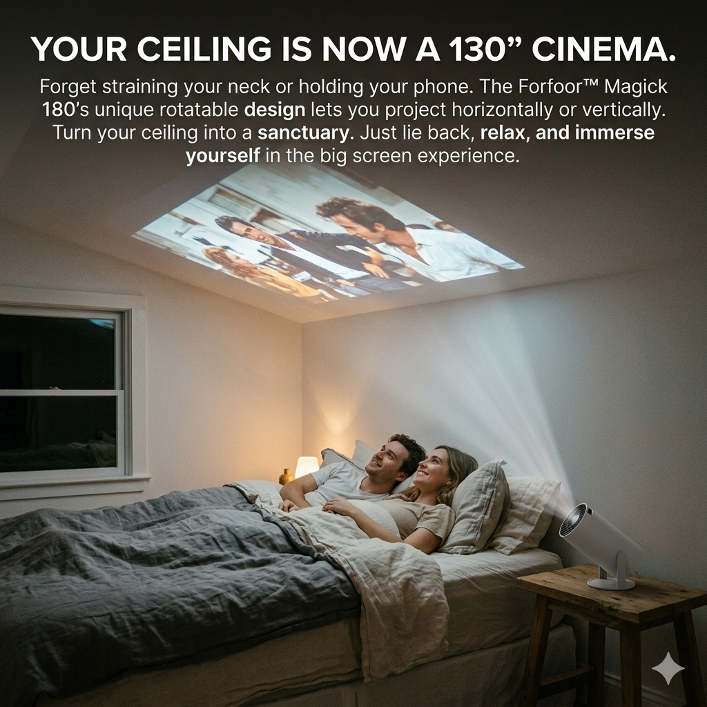 I was skeptical at first, but the Magick 180 is honestly incredible. The 180° rotation is no joke—I have it pointed straight at my ceiling, and the auto-keystone squared the image perfectly in seconds. No more propping up pillows to hold my laptop. The electric focus via remote is super smooth. Best investment for my bedroom cinema!